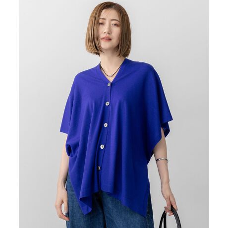上質な素材感を活かした、ワイドシルエットのニットポンチョ。前後左右斜め、様々な着こなし方で雰囲気を変えられます。脇には隠しボタンが付いているので、ボタンを閉めればきちんと感を演出し、外せば軽やかなドレープシルエットを楽しめます。タンクトップやTシャツの上にはもちろん、シャツやタートルネックとのレイヤードも可能なので、シーズンレスで温度調節に重宝するアイテムです。いつものコーディネートにプラスするだけで、ぐっとおしゃれ度がアップします。カラーは、インナーとのコントラストが楽しいブラック(#005)、ニュアンス感のあるカーキ(#054)、鮮やかで目を引くブルー(#070)の3色展開です。