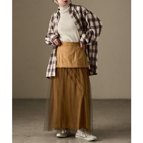 スエードミニスカートにチュールロングスカートを重ね着したかのような個性的な1着。
