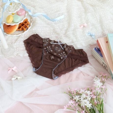 小花とアイシングクッキーの刺繍をミックスした、甘く可愛らしいシリーズです。アイシングクッキーの中にも小花柄をしのばせて、全体にやさしくきらめくラメ糸をあしらうことで、ガーリーな中にも上品さを演出。丸みのあるスカラップはボーラー手法をほどこし、手作りクッキーのようなイメージに仕上がりました。フロント中央には細めのリボンをあしらい、繊細な女の子らしい印象でまとめています。クッキー型のアップリケには輝くラインストーンを添えて、華やかさをプラスしました。お菓子のようなカラーリングのランジェリーで、甘くときめく日常をお届けします。