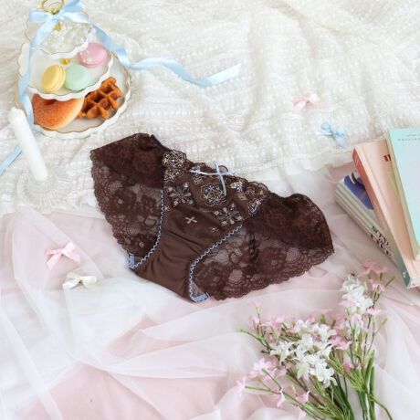 小花とアイシングクッキーの刺繍をミックスした、甘く可愛らしいシリーズです。アイシングクッキーの中にも小花柄をしのばせて、全体にやさしくきらめくラメ糸をあしらうことで、ガーリーな中にも上品さを演出。丸みのあるスカラップはボーラー手法をほどこし、手作りクッキーのようなイメージに仕上がりました。フロント中央には細めのリボンをあしらい、繊細な女の子らしい印象でまとめています。クッキー型のアップリケには輝くラインストーンを添えて、華やかさをプラスしました。お菓子のようなカラーリングのランジェリーで、甘くときめく日常をお届けします。