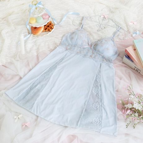 小花とアイシングクッキーの刺繍をミックスした、甘く可愛らしいシリーズです。アイシングクッキーの中にも小花柄をしのばせて、全体にやさしくきらめくラメ糸をあしらうことで、ガーリーな中にも上品さを演出。丸みのあるスカラップはボーラー手法をほどこし、手作りクッキーのようなイメージに仕上がりました。身生地から裾まで大きくV字カットしたレースを4ヶ所使用することで、おしゃれにスタイルアップ。カップ下には刺繍レースをあしらい、異なる透け感をお楽しみいただけます。ストラップにはクッキー型のアップリケを添えて、輝くラインストーンが華やかさをプラス。バスト中央には細めのリボンをあしらい、繊細な女の子らしい印象でまとめました。お菓子のようなカラーリングのランジェリーで、甘くときめく日常をお届けします。