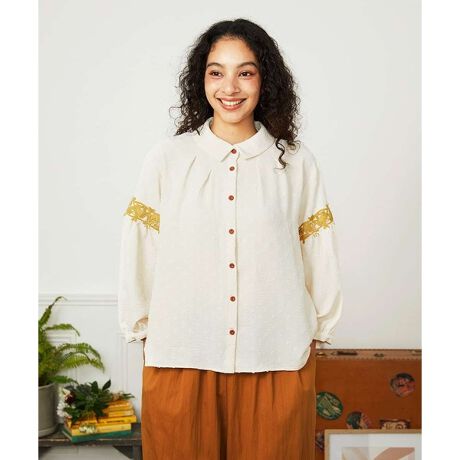 ポコポコした生地が特徴のブラウス。テーマの「丘の上の道」からインスピレーションを受けています。前後のタックとドロップショルダーで叶うリラクシーなシルエット。お花の中に隠れている動物柄のオリジナルレースがこだわりポイントです。レース下にギャザーを入れたふんわりとした袖が大人かわいい雰囲気を後押し。羽織としても一枚着でもお召しいただけるレースブラウスは今季イチオシのオススメアイテムです。