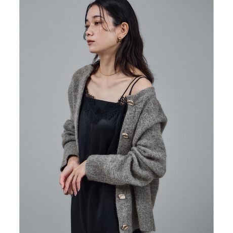ニュアンス感のある有機的なメタルボタンが目を引く、前後2WAY仕様のシャギーカーディガン。