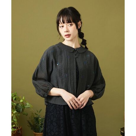 刺繍が大人かわいいブラウスライクなジャケット。たっぷりとした分量感とドルマンスリーブで夏場も涼しく着られるシルエットです。全体に施されたお花や植物の刺繍が、コーディネートに華やかさをプラス。首元にあしらったボタンがアクセントに。ふんわりスリーブで涼しく体型カバーを叶えます。衿付きデザインで日常使いからお出かけまで幅広く着まわせる一枚です。※GJJHA51250のリピート商品です。