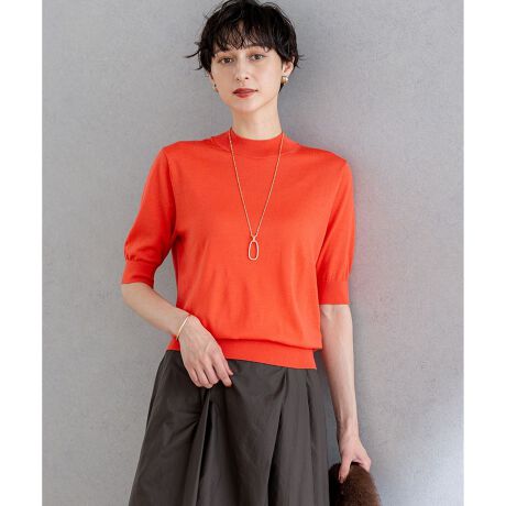 上質な素材が心地よい、モックネックの五分袖ニット。一枚で上品な着こなしはもちろん、秋のおしゃれ気分をさらに高めるアンサンブルでのシックな着こなしもおすすめです。ジャケットやカーディガンのインナーとしても活躍し、オフィスシーンから普段使いまで幅広く対応します。首元をすっきりと見せつつ、エレガントな印象を与えてくれる一枚です。長くご愛用いただける深みのあるベーシックカラーに加え、コーディネートのアクセントになる華やかなシーズナルカラーの4色展開。抜け感のあるライトグレー(#003)、パッと目を引くオレンジ(#020)、爽やかなブルー(#070)、洗練された印象のネイビー(#075)のカラーラインナップです。