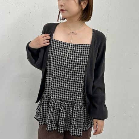 長め着丈のカーディガンはボタンを閉じるとウエストマークしてくれるのでスタイルアップに。