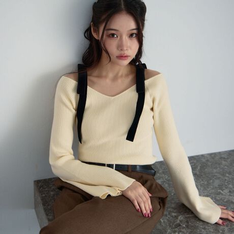 肩にあしらったベロアリボンが視線を惹きつける、着映えトップス。