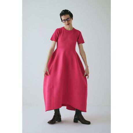 リブニットで上半身を仕立てたワンピーススカート部分の立体感がとても造形的です。1枚でスタイリングがモードに決まります。足元のチョイスで様々なテイストを楽しむことができます。マットなポリエステルの細い糸を多本取りし、ジャージのように編んだニット素材を使用しています。ボリュームニットドレス[注意事項] ※画像の商品はサンプルです。実際の商品と仕様、加工が若干異なる場合があります。 ※画像の商品は光の照射や角度、お使いのモニター環境により、実物と色味が異なる場合がございます。 ※着用、お取り扱いの際は、アテンションタグをご確認ください。
