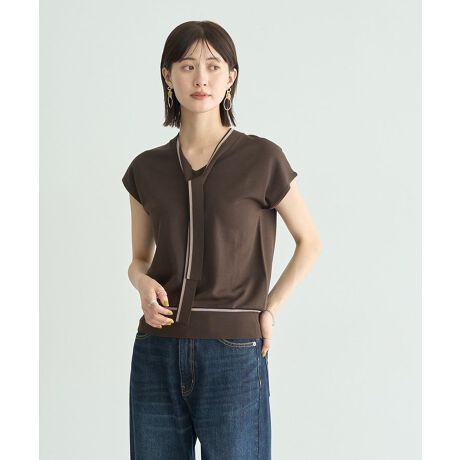 Vネックにはボウタイリボンのアクセントをプラスし、配色ラインが引き締めアクセントに。