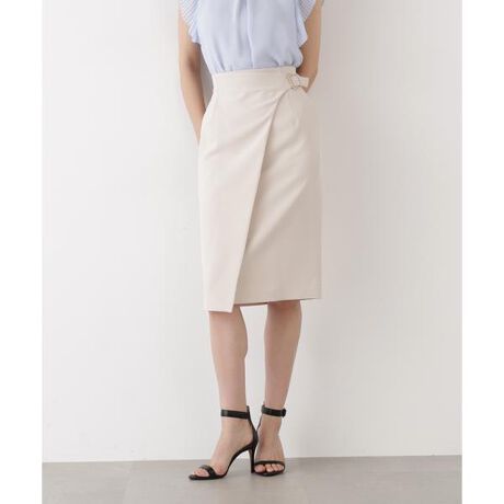 スッキリとしたタイトシルエットとラップデザインがきちんと感と女らしさを叶えるスカート。ウエストサイドにあしらった少し大きめなフラットメタルバックルでアクセントをプラス。後ろウエストはゴム仕様で履き心地の良さも特徴です。