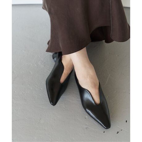 すっきりとしたスクエアトゥの甲深デザインパンプス。