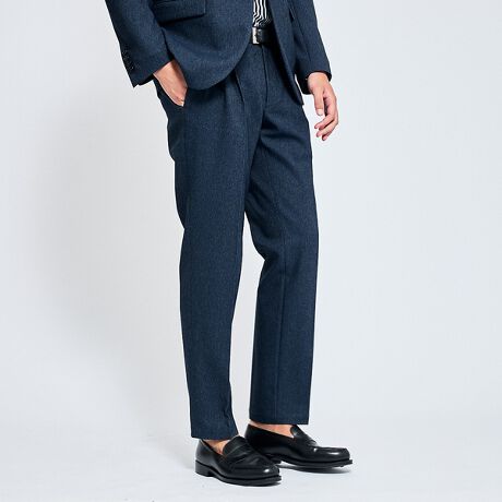 ワンタック仕様により腰まわりには程よいゆとりを持たせつつ、すっきりとしたシルエットを実現。ウエストには共地のゴムシャーリングを施し、イージーパンツ仕様に仕上げています。