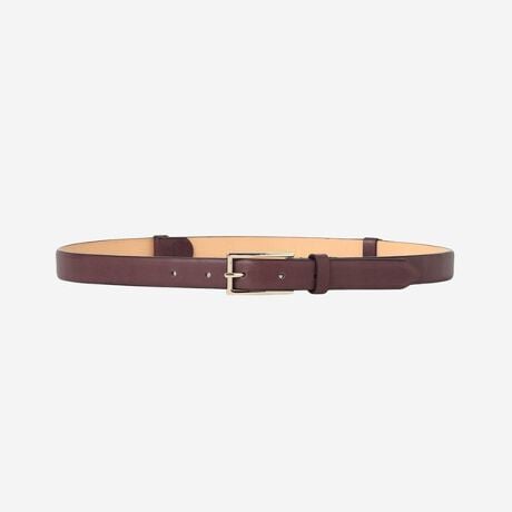 コの字型のバックルに風合のある革を合わせたアジャストベルトです。革の鞣しはタンニンとクロムを併用し、使うほどに風合いが増すエイジング効果があります。仕上げは染料を塗り重ね、オイルを浸透させ、ロールアイロンでプレスすることにより、深く味わいのある透明感と艶感を際立たせています。バックルのピンでサイズ調節できる他、背後のレザーをスライドさせて自由にサイズ調節出来るので、パンツは勿論、ワンピース、スカート、アウター、ストールの上からなど様々なスタイルに便利にお使いいただけます。