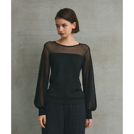 [型番:0225343058]16ゲージの上質なヴィスコースで編み立てた、しなやかな着心地のニットトップス。 ヨークと袖がシアー編みになった、ほのかに漂う女性らしい雰囲気が魅力のアイテム。袖をふっくら愛らしく仕上げ、シンプルながらも個性を効かせました。晩夏から初秋にかけてぴったりな着回し力の高いアイテムです。※こちらのモデル着用画像はサンプル品を撮影しております。実際の商品と仕様、加工、サイズが若干異なる場合がございます。予めご了承くださいませ。