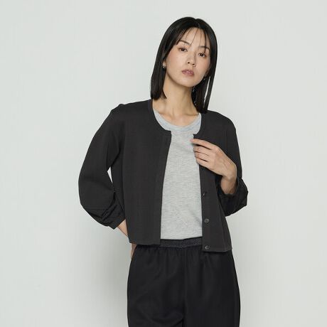 ミラノリブというしっかりとした伸縮性のある編地を使用して、ニットならではの着心地の良さときちんと感を両立させたミラノリブショートジャケットです。