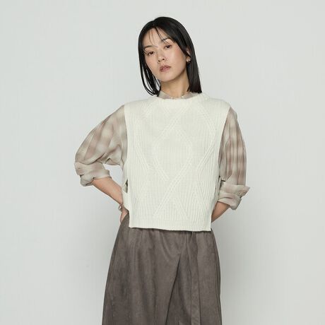 ギャバジンKT定番素材のマシュマロヤーンを使用してふんわり編んだマシュマロニットベストが登場です。