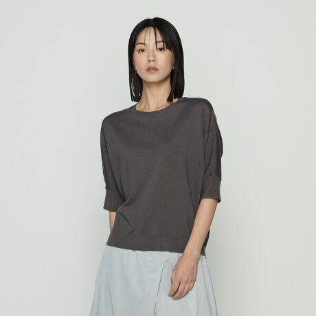 [型番:78-21EM01-205]《デザイン》伸縮性のあるニット素材でしわにならず、Tシャツ感覚で手軽に着ることができるニットとカットソーの良い部分を併せ持った、とても汎用性の高いアイテムです。オンにもオフにも着られるように、デザインはシンプルですが気になる二の腕やウエスト周りもしっかりと隠してくれるシルエットなので、リラックスして着られます。《素材》滑らかな肌触りと柔らかさがあり、ハイゲージのきれいめな天竺で仕上げているので上品な光沢感があります。