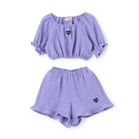 ギャザーを寄せたスクエアーのネックラインとふんわり袖のトップス、裾フリルが可愛いショートパンツのセットで、おしゃれなリラックススタイルが即完成します。