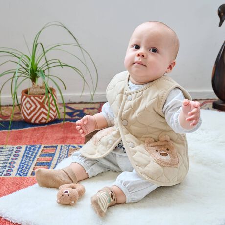 クマさんのお顔をあしらったポケットがかわいいベストです。