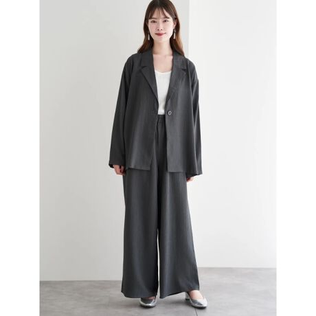 表面感があり涼しく着られる楊柳素材のジャケット×ワイドパンツの2点セット。