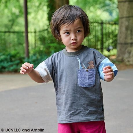 ダンガリーポケットから恐竜が覗いている、ユニークなデザイン。