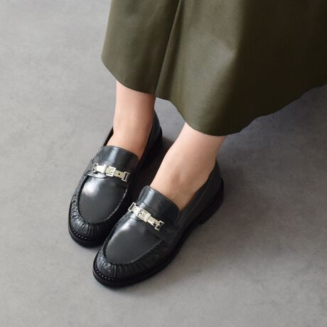 メタルベルトのビットデザインが印象的なラウンドトウのローファーです。