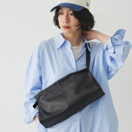 直線的なラインとすっきりとしたフォルムが魅力のレザーショルダーバッグ。