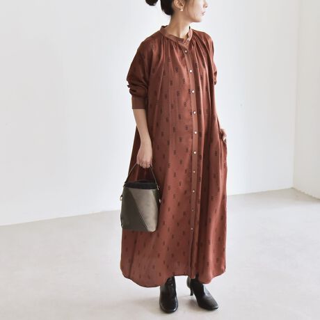 ヴィンテージライクなプリントが印象的なバンドカラーのロングシャツワンピース。