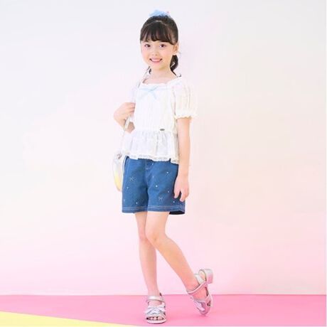 上品なリボン刺しゅうとラインストーンが魅力あふれるデニムショートパンツです。