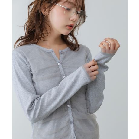 全体的に重ねられたチュールがポイントのカーディガントップスです。チュール部分はカットソー部分と同じ色のベースに淡さを加えた色味になっているので統一感のあるトップスになっています。ボタンのホワイトの色味がアクセントになっています。カットソー部分は柔らかいコットンを使用しているので敏感肌の方にもご着用いただけます。カーディガンとしてもトップスとしてもお使いいただける万能アイテムです。