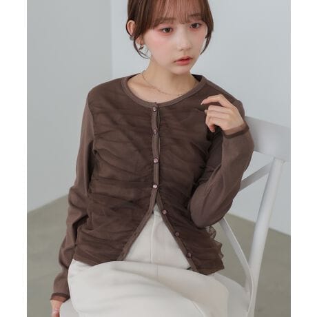 全体的に重ねられたチュールがポイントのカーディガントップスです。チュール部分はカットソー部分と同じ色のベースに淡さを加えた色味になっているので統一感のあるトップスになっています。ボタンのホワイトの色味がアクセントになっています。カットソー部分は柔らかいコットンを使用しているので敏感肌の方にもご着用いただけます。カーディガンとしてもトップスとしてもお使いいただける万能アイテムです。