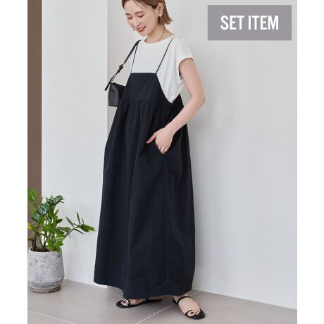 キャミソールワンピースとベーシックなノースリーブTシャツのセットアイテム。ナイロン素材の爽やかな素材で仕立てたワンピースは裾に向かって広がるふんわりシルエットで風通し良く、暑い夏も爽やかに着用いただけます。華奢な肩ストラップは好みのサイズに合わせて長さ調節可能。デイリーに最適なデザイン性と、単品使いもできる汎用性の高さを両立した頼れるアイテムです。透け感[ややあり]