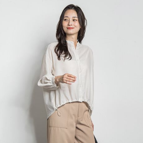 ほんのり透け感と光沢を備えた素材を使用した、バンドカラーのシアーブラウス。