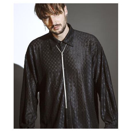 幾何学的なジャカード織りと涼しげなシアー素材が織りなす、繊細かつエッジの効いたBIGシャツ。晩夏の装いに軽やかなモード感を添える、NO ID.らしい素材使いとシルエットバランスが光る1枚です。
