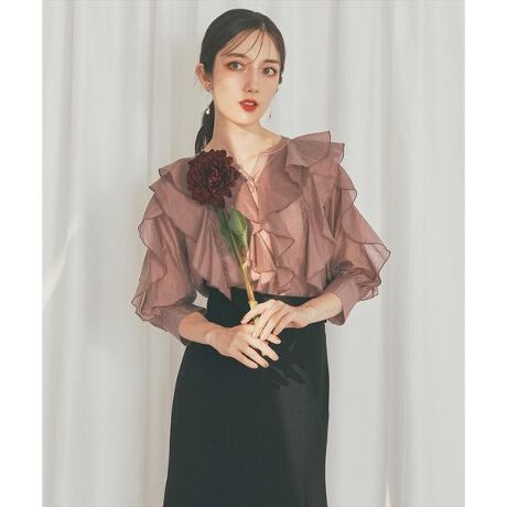 【花びらのようなラッフルフリルが華やかに女性らしさを引き立てる一枚】【Point】・ほんのり透け感のあるシアー素材で、上品さと華やかさを両立させたブラウス。・デコルテをすっきり見せるキーネックデザインで、甘さを抑えた大人な印象に。・スカートにもパンツにも合わせやすく、オフィスからお呼ばれシーンまで活躍する万能ブラウスです。・身頃部分には裏地を付けているのでインナーの透けに悩まず着用できるのも嬉しいポイントです。ケア方法:手洗い可能透け感:あり裏地:身頃部分あり伸縮性:なし光沢感:微光沢生地の厚さ:薄手
