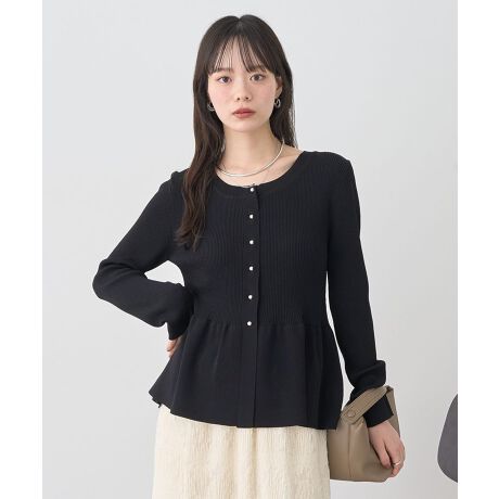 パール風ボタンがフェミニンな雰囲気のニットカーディガン。触れるとひんやり感じる接触冷感素材で仕立て、まだ暑い時期から秋らしい着こなしをお楽しみいただけます。ペプラムシルエットがさりげなく体型カバーを叶え、スタイルアップを後押し。前ボタンを開けて羽織ものとしても活躍する汎用性の高いアイテムです。