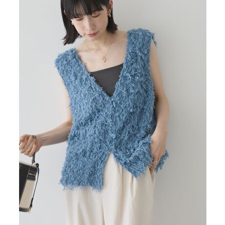 前後2WAYで楽しめる揺れるフリンジが華やかなデザインベスト。小さなボタンの前明きVとシンプルなUネック、どちらも着回しやすく印象的なスタイリングに仕上げてくれます。ゆとりあるシルエットながら首元の抜け感が顔周りもすっきりと演出。シンプルなTシャツに合わせるだけでこなれ感を上げてくれる今季おすすめのアイテムです。透け感[ややあり]