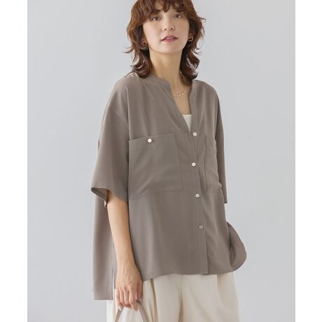 品のある金釦とミリタリーなダブルポケットが特徴的なデザインシャツ。肌離れの良いさらりとした素材で暑い時期でも快適に着用いただける爽やかさが魅力です。少し長めの袖丈で気になる二の腕も自然にカバー。スキッパーネックにゆとりあるシルエットでこなれ感あるヘムラインが雰囲気たっぷりに演出します。イージーパンツを合わせたリラックススタイルがおすすめ。透け感[なし]