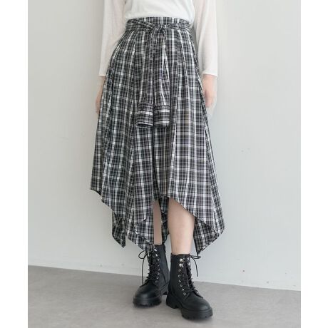 アシンメトリーのイレギュラーヘムが歩くたび豊かに揺れるチェックスカート。Aラインシルエットにシャツを腰巻きしたようなウエストリボンが目を惹くデザインです。後ろゴム仕様で着脱しやすく、快適な穿き心地も魅力的。シンプルなカットソーやブラウスを合わせるだけで個性派スタイルが決まるおすすめのアイテムです。透け感[なし]