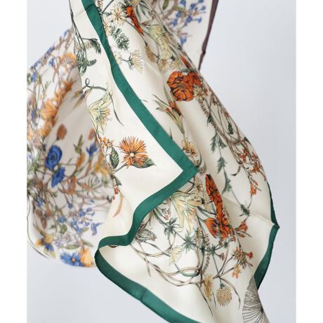 ヴィンテージ感漂うフラワー柄とレトロな配色がコーディネートのアクセントにぴったりなスカーフです。両面にプリントされているので、表裏を気にせず使えます。70センチの大きめなサイズなので首まわりだけでなく、ヘッドアクセサリーやバッグを飾るチャームとしても活躍します。※モデルの着用画像の場合、光の当たり具合により、実際の色味と異なって見えることがございます。色味は、商品単体の画像をご参照ください。