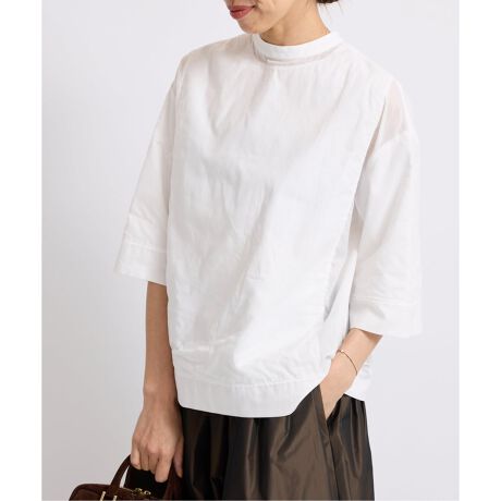 一見シンプルながら、身頃や袖にさりげなく透け感を仕込んだデザインが魅力のスタンドカラーブラウス。