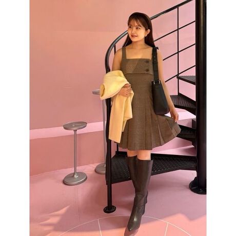きちんと感と女性らしさを兼ね備えた、程良い肉感のある秋冬ツイル生地でお作りした、トレンディーなミニジャンスカが届きました。上に重ねたサイドの2つボタンディテールがアクセントのビスチェは、セパレートなので取り外してそれぞれ単体でのご着用が可能です。ビスチェを外すとキャミソール型のワンピースになります。肩紐にはアジャスタ付き。ワンピの背中側にはゴムシャーリングを加えてフィット感を加え着心地良く仕上げました。ウエスト位置切り替えを腰位置高めに設定し、スカート部分はサイドからバックにプリーツを入れたAラインシルエットで脚長効果を演出します。ボウタイシャツ(SWFB254204)をインしたスクールガール風のスタイリングもおすすめです。シーンによって雰囲気を変えて、コーディネートを楽しめます。