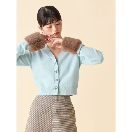 トップス感覚で着こなせるコンパクトなシルエットに、ふわっとしたファースリーブをドッキング。華やかさと抜け感を絶妙に両立したデザインです。フロントにはビジューボタンをあしらい、光を受けて上品にきらめきます。袖のファーは取り外し可能で、アウターを重ねる季節にはビジューカーディガンとして活躍する2way仕様。