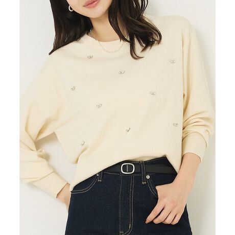 さりげないビジューが目を引くコンパクトなニットトップス。旬のスタイリングに使いやすいショート丈に仕上げ、コンパクトながらも、袖などはふんわりと着心地の良いサイズ感になっています。甘く見えすぎないようビジューのデザインや配置にもこだわりました。