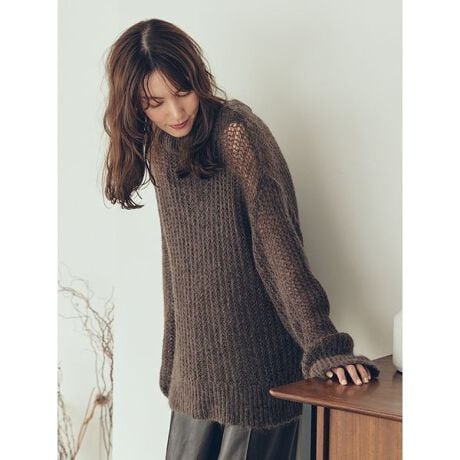 肌の見え具合や透け感が計算されているので、インナーで悩まずに着こなせる、大人のためのシアーアイテムセットです。まだまだ暑くても、思わず手に取ってしまう愛嬌たっぷりのローゲージモヘヤは、ゆるふわな編み地で透けを楽しめる一枚。