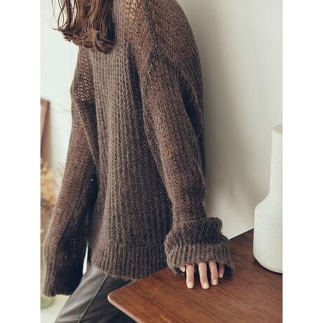 肌の見え具合や透け感が計算されているので、インナーで悩まずに着こなせる、大人のためのシアーアイテムセットです。まだまだ暑くても、思わず手に取ってしまう愛嬌たっぷりのローゲージモヘヤは、ゆるふわな編み地で透けを楽しめる一枚。