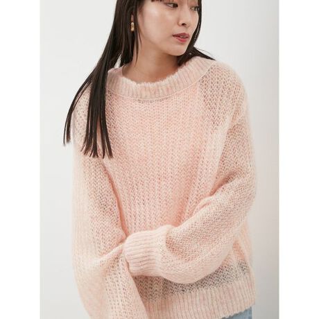 肌の見え具合や透け感が計算されているので、インナーで悩まずに着こなせる、大人のためのシアーアイテムセットです。まだまだ暑くても、思わず手に取ってしまう愛嬌たっぷりのローゲージモヘヤは、ゆるふわな編み地で透けを楽しめる一枚。