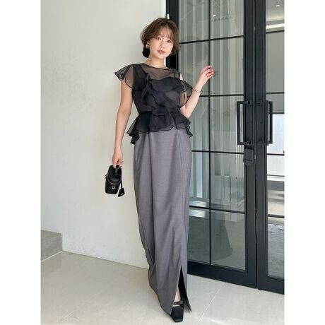 また、キャミドレスはマキシ丈のロング&リーンシルエットで、ミニマムなデザイン。単品でもモードに着こなせますが、ラッフルフリルブラウスをプラスすると、フェミニンな気品が加わります。
