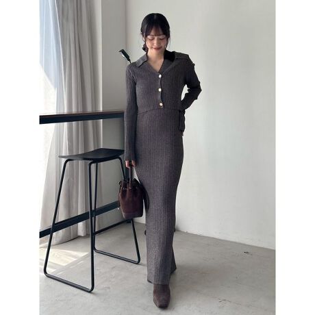 カーデとワンピそれぞれにポロ風の襟がついていて、一緒に着ると2枚が重なり、トレンドの襟レイヤードスタイルが簡単に完成します。