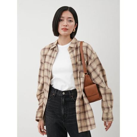 また、ネルシャツを腰に巻いたスタイリングも、今季らしいムードでおすすめです。